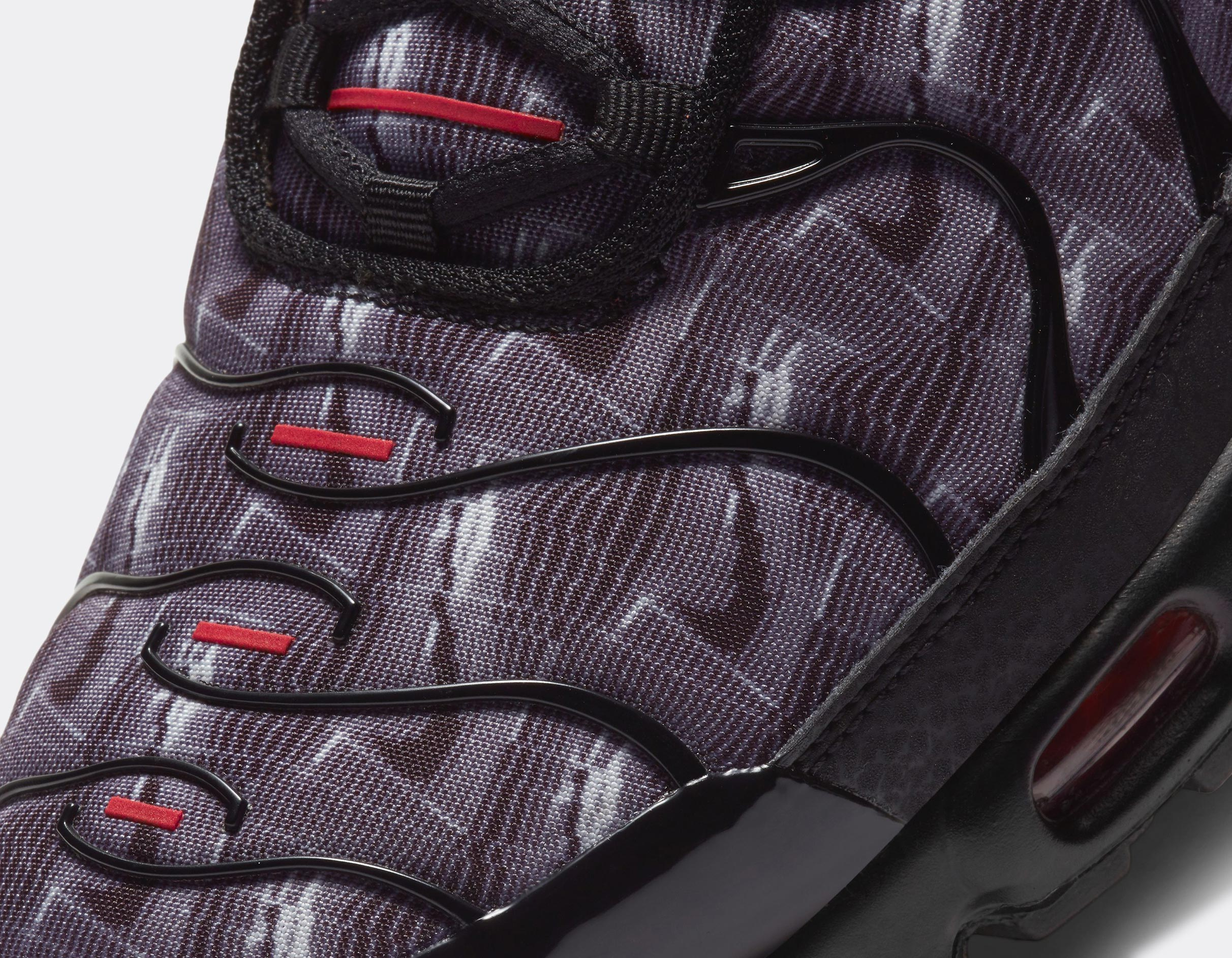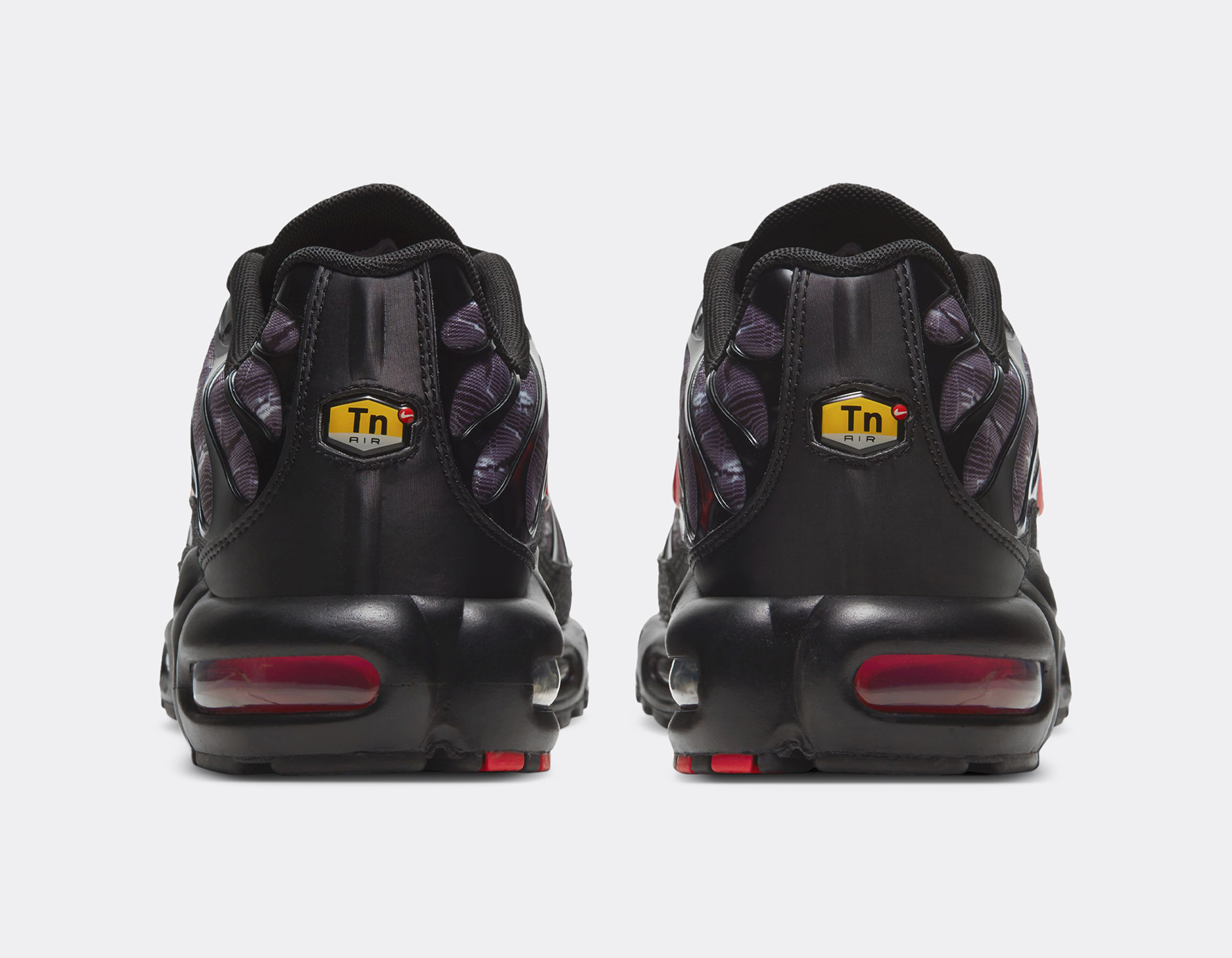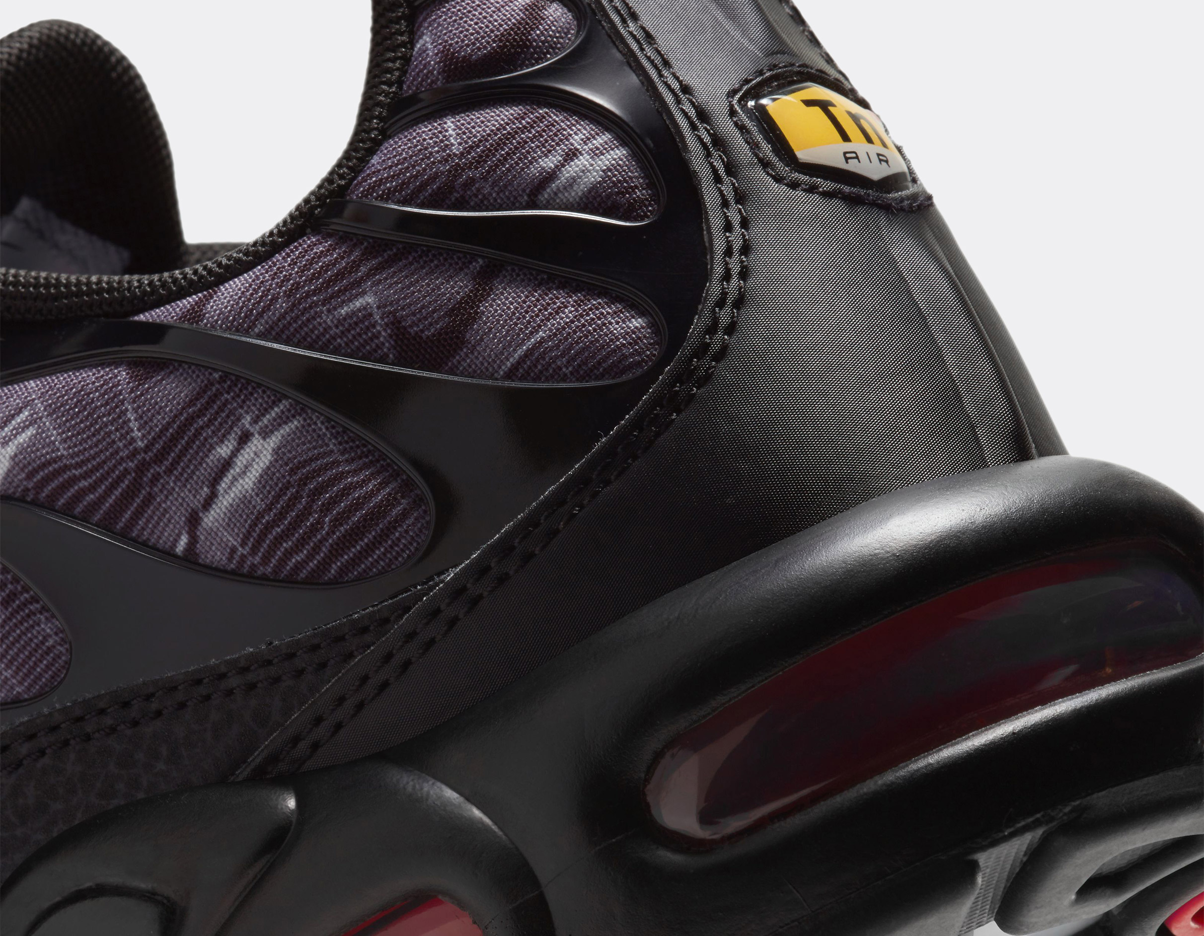 Au talon, le logo “Tn Air” jaune signe l’héritage de la gamme. Le tout forme une paire au style sombre, détaillé et résolument urbain — parfaite pour ceux qui recherchent une sneaker à la fois technique, graphique et discrètement audacieuse.